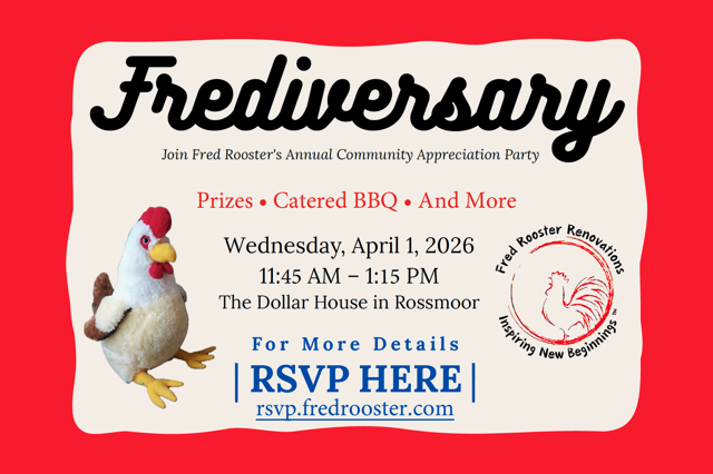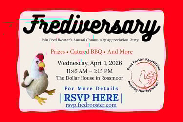Come join our Annual Community Appreciation Party with Fred and his friends as we take a (short) break from renovating properties to recognize everybody who has helped Fred Rooster this past year. This year will be catered boneless BBQ with meat, veggies, fixins, beverages and desserts (no chicken though, understandably Fred objected).